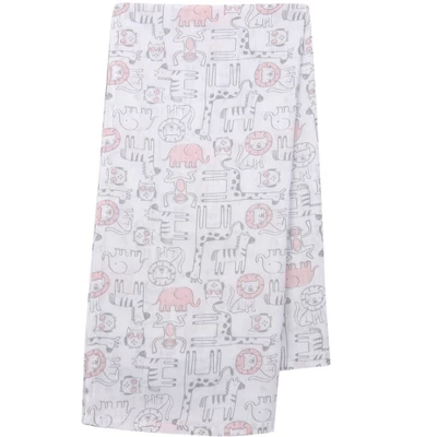 Start any baby off in style with this five piece gift set. This adorable collection of goodies comes all wrapped up and ready to give in a soft furry white minky bag with decorative baby pink pom poms. The gift bag measures approximately 8” high by 7” in diameter. This designer keepsake bag is filled with useful goodies including a 100% cotton muslin swaddle blanket in a charming animal print in shades of pink and gray. The swaddle blanket is 44” X 44”. Add to that a kidney bean shaped 100% cotton muslin burp cloth that is 22 ½ ” X 11” in the adorable animal print that is perfect for feeding time. A cotton jersey pink heather newborn hat which can be folded up at the rim and tied into a knot on top is also included along with a cute furry gray elephant that is 9” tall. His inner ears are a heather pink jersey and he is sure to be one of baby’s favorite keepsakes.