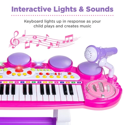 - INTERACTIVE LIGHTS AND SOUNDS: This 37-key kid’s keyboard lights up as your child plays with 8 different instrument sounds such as piano, violin, and more and even comes with a working microphone