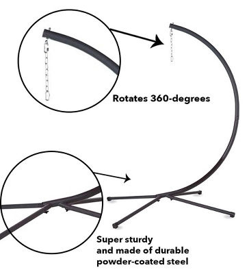 - Durable powder-coated steel Crescent Hanging Chair Stand includes two C hooks and a 16″ chain