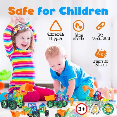 - 70-piece set of creative magnetic blocks building set for kids includes 20 triangles, 27 squares, 2 diamonds, 2 trapezoids, a car body, a bulldozer arm, 2 big wheels, and more for building different shapes