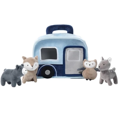 This unique two-toned interactive plush camper RV is approximately 9 inches long by 7 ½ inches high by 4 inches wide. It has a navy velour handle for easy carrying. This rectangular shaped camper has two felt wheels. There is one window opening for the animals to get a peek a boo view of the outside. There is a 5” X 3 ½” door made of gray velour and has a hook and loop strip for opening and closing. There are four plush animals included in this set. One taupe color velour fox with a white face, one gray bear with a white muzzle, one taupe color wise velour owl and one gray deer with embroidered white spots. All the animals have embroidered faces making them baby safe. This is a great developmental toy as well. Children can use their fine motor skills to put the animals in and out of the different openings and cognitive imaginary skills as they play with all the different animals. This interactive camper makes a great baby shower gift, toddler birthday gift, or welcome home baby gift.