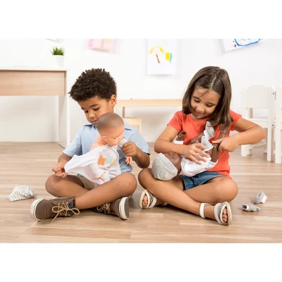 Part of a collection of clothes and accessories for a new-born dolls. It includes the most common clothes and accessories in everyday baby situations such as bath time, nap time or going out for a walk. With different types of fasteners to help the development of fine psychomotor skills. Comes with 1 pajama and 1 cap. Gender neutral colors. Soft to the touch fabric. Perfect accessory for 15″ dolls.