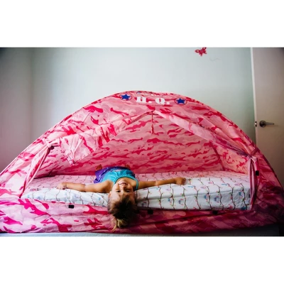Our Pink Camo Bed Tent is perfect for any child with a love for fun, colorful designs! This 77 in X 38 in X 35 in bed tent perfectly fits any twin-size mattress, making it the ultimate hideout fort or reading nook. The Ultra-Mesh keeps fresh air coming in and the doors can be tied back, making it a great space to hang out in day or night. There’s even an interior pocket for all those important goodies! The included nylon storage bag also makes it easy for travel and storage for wherever your little one chooses to dream.
