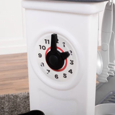 - REALISTIC FEATURES: Open and close fridge, freezer and oven doors. Clicking knobs and electronic lights and sounds on the stovetop and pretend ice dispenser in the fridge add fun sensory elements. Clock has working hands to practice telling time.