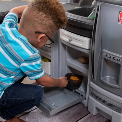 Everything a real kitchen has to offer is in this deluxe play kitchen set. The Grand Walk-In Classic Kitchen & Grill™ features so many fun details and a large footprint that encourages social play with multiple children! Walk into the kitchen playset to discover the three-sided play area details, from the “stainless steel” appliance finishes and molded-in floor to the white cabinets, pull-out storage space, and extra-large countertop. Activate the realistic lights and sounds of the stovetop burner with the special cookware, then use the molded-in sink with swivel faucet to wash the dishes after the dinner party. Plus, this large pretend kitchen comes with a 103-piece accessory set for kids to immediately start meal prep for their next gathering. Kids can’t wait to get cooking and entertaining in their very own kitchen! Made in USA of US and imported parts.